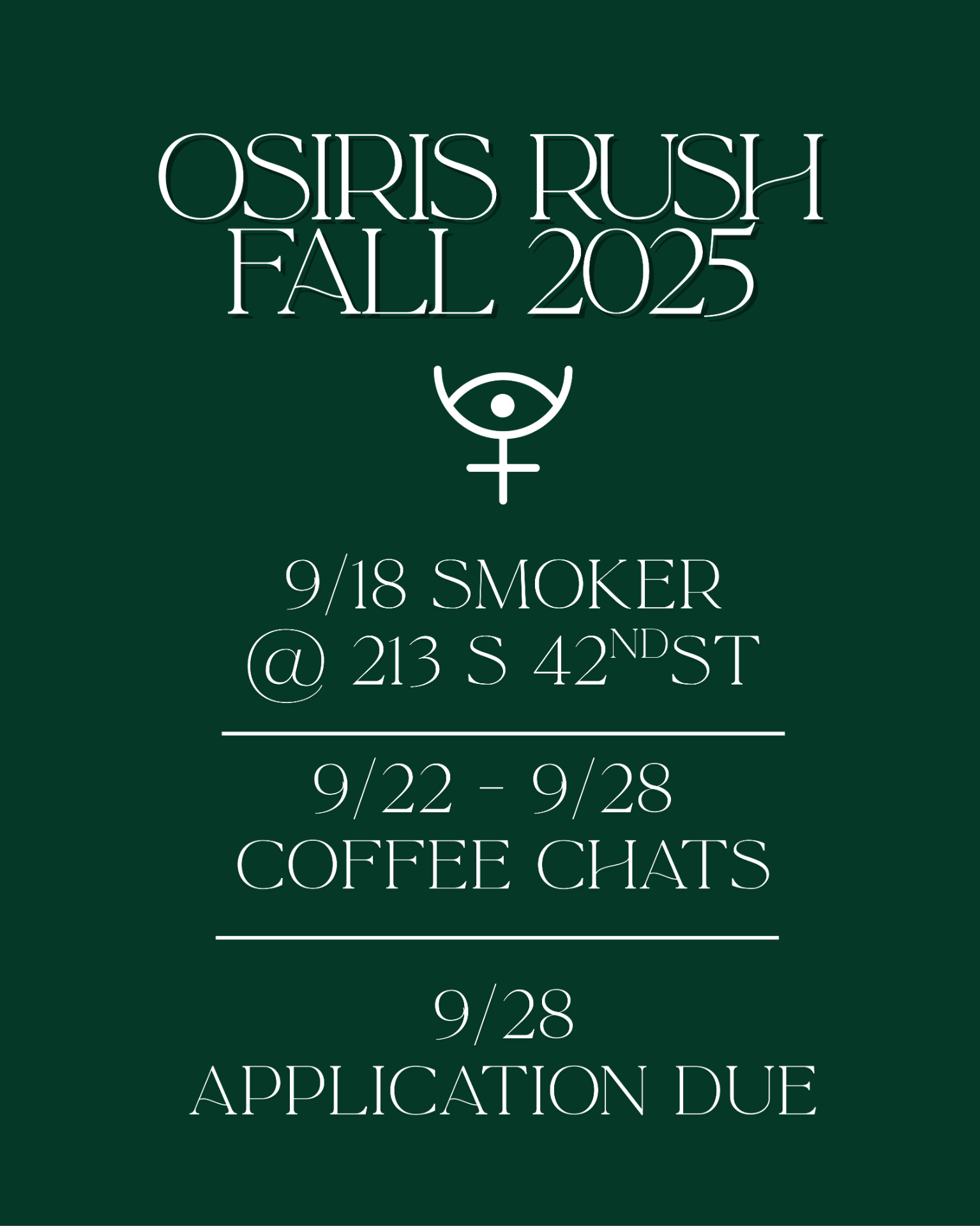 Osiris Senior Society, founded in the spring of 2013 by Lainie Huston and Jackson Foster, brings together senior leaders and outstanding members of the arts community at the University of Pennsylvania. The society draws its name from the god Osiris, who was believed by some in ancient Greco-Egyptian times to have been the god who brought together the nine muses. Similarly, the society provides a forum for students of different art forms, including theatre, tech, dance, speech, and vocal and instrumental music, costuming, and visual art to strengthen ties across the arts community at the University of Pennsylvania.